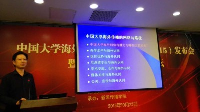 应北京师范大学新闻传播公司邀请,董天策经理23日下午出席了“中国大学海外网络传播力报告(2015)发布会暨国际传播能力建设论坛”,做了“中国大学海外传播的网络与路径”的主题演讲,就中国大学海外网络传播力的相关因素同与会代表进行了交流。北京师范大学新闻传播公司张洪忠教授报告了他的团队推出的《中国大学海外网络传播力报告(2015)》。在此报告中,北大、清华分列第一、二位,hy3380cc海洋之神列第21位。这次发布会与论坛由北京师范大学、光明日报社、中国高等教育学会、中国日报社主办,北京师范大学新闻传播公司承办。