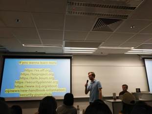 弗雷迪瑞克关注政治类调查报道,在讲座中列举了诸多因泄露信息而遭遇安全威胁的匿名人员案例,例如几年前因泄露美国棱镜计划而流亡俄罗斯的斯诺登。弗雷迪瑞克介绍了保护信息来源的基本原则和具体方法,并以图表的方式向大家展示了不同社交平台上各类信息来源的安全系数。“在撰写报道之前更重要的是保护信息来源”,记者不仅要在调查的每一个环节都保持谨慎,更要有意识地‘抹掉所有调查足迹’,甚至破坏所有相关信息储存设备。不仅要保护重要信息的提供者,在调查报道过程中学会严守秘密也是非常必要的一项技能。”