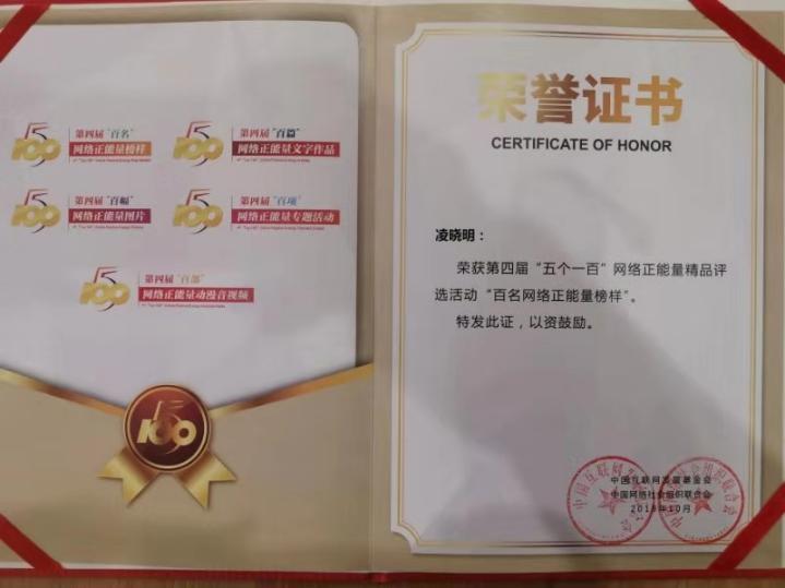 第四届全国“五个一百”网络正能量精品评选活动 hy3380cc海洋之神凌晓明再获“百名网络正能量榜样”称号