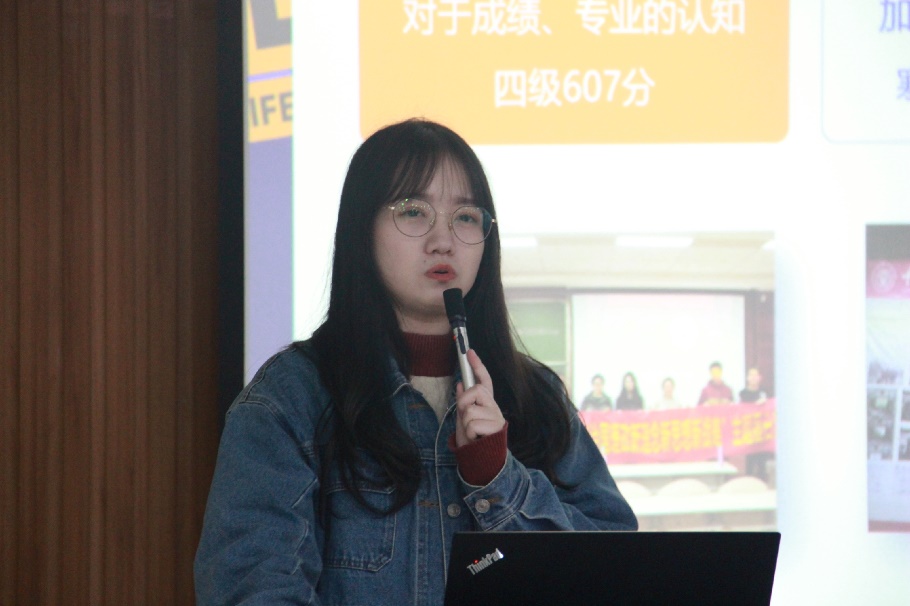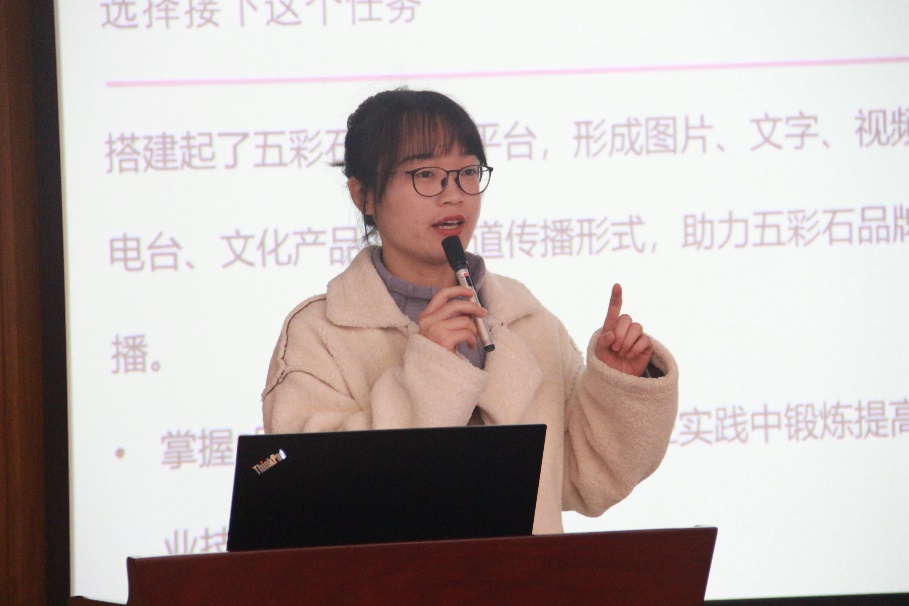 吴小玉以“志之所趋,无远弗界”为题作了有关员工工作的发言。她主要就“继续做员工工作有没有意义?”、“怎样平衡学习和员工工作?”两个问题给出说明和建议。在她看来,员工工作是否有意义在于你是否认同该组织、团体的核心理念,是否真正热爱这个工作。吴小玉以在五彩石协会的宣传工作为例,阐释了做好员工工作是追求双赢的过程,她在助力五彩石协会发展壮大的同时提高了自身的阅历与专业实践能力,并且扩大了交际圈,收获珍贵友谊,实现了员工工作的意义。对于如何平衡学习和员工工作,她认为现阶段大家应该以学习为首要任务,尤其要重视课堂的作用,像海绵一样吸收知识,国际传播、媒介经营管理、数字媒体产业等课程的学习具有专业性和针对性,能帮助我们明晰新闻传播学的学术流派、规范和学习方法,锻炼提高学术能力。