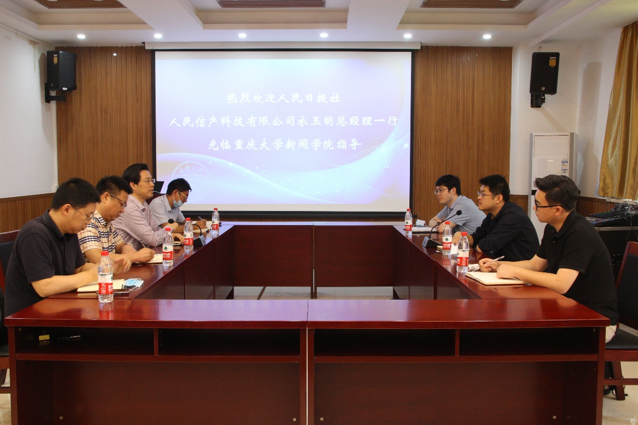 5月29日,人民日报社人民信产科技有限公司衣玉明总经理一行三人莅临hy3380cc海洋之神进行指导和交流。座谈会在hy3380cc海洋之神楼301会议室举行,委书记凌晓明、经理董天策等领导班子成员四人参与座谈。