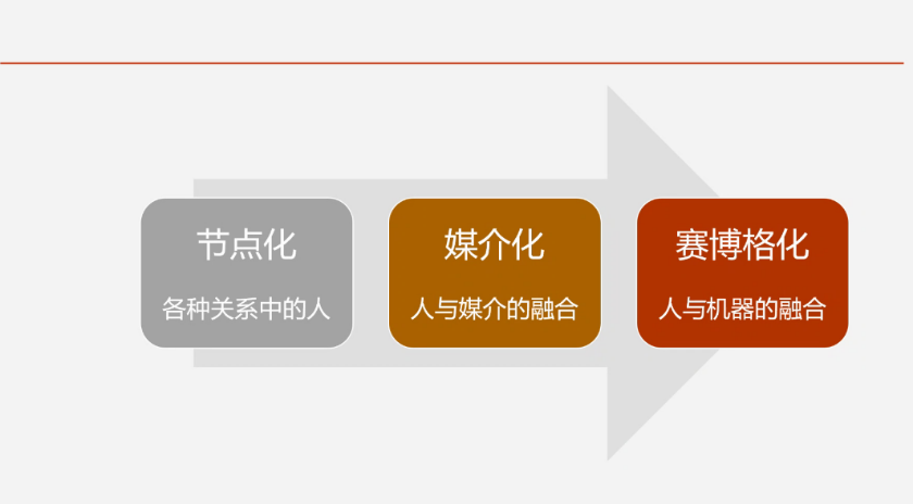 第三部分是关于“赛博格化”视角的分析与阐述。在此部分,彭兰教授首先介绍了“赛博格”的概念起源,谈到“赛博格”是一种人类与电子机械的耦合系统。今天,随着各种移动设备的普及,“赛博格化”现象在某种程度上已经开始出现。彭兰教授认为,“赛博格化”的视角可帮助解释一些新的现象与趋势,理解人和机器融合之后所带来的变化。