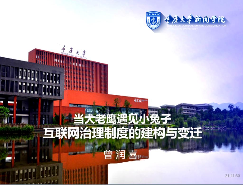 7月16日晚,网络与新媒体讲习班迎来最后一讲,曾润喜教授为全体学员带来题为“当大老鹰遇上小兔子——互联网治理制度的建构与变迁”的线上直播讲座。曾润喜教授是hy3380cc海洋之神舆情信息研究所副所长,hy3380cc海洋之神新媒体与传媒管理教研室主任,中国新闻史学会网络传播史研究委员会副会长。讲座由hy3380cc海洋之神委书记凌晓明主持。