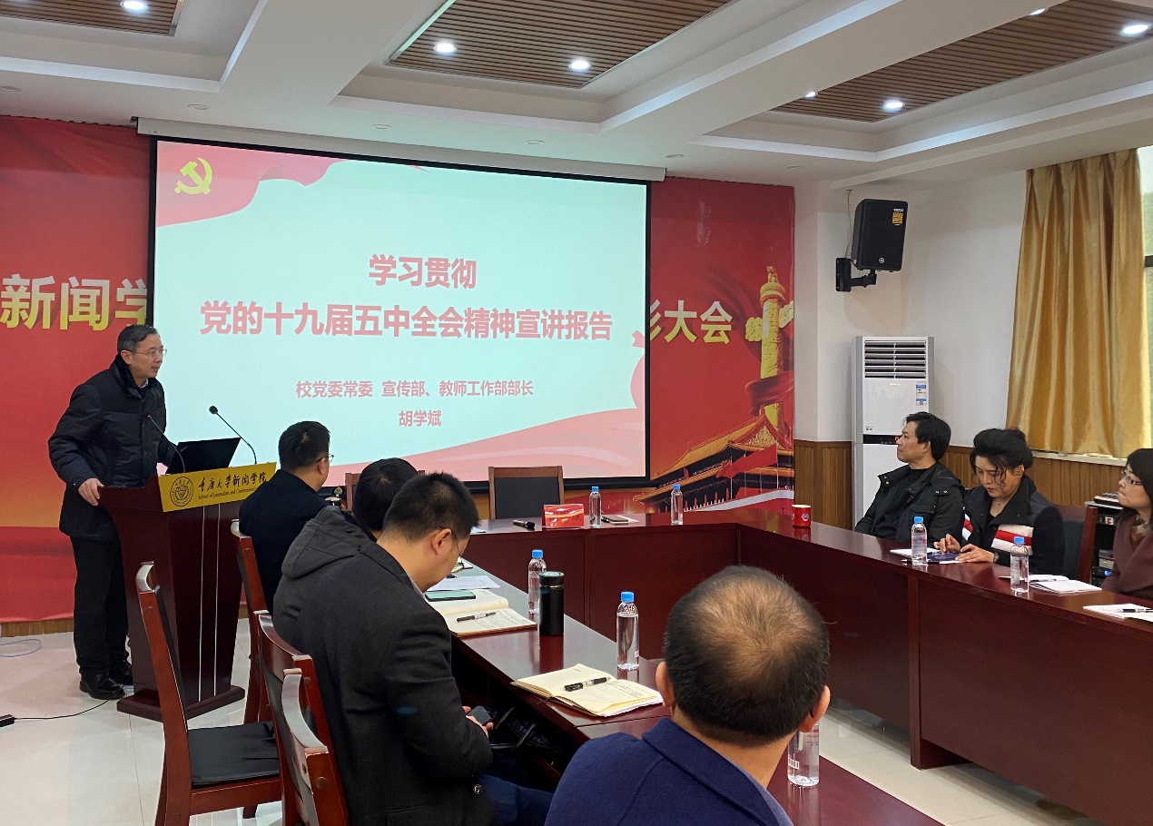 2020年11月26日下午,hy3380cc海洋之神与公司党委宣传部(教师工作部)联合开展 “学习贯彻党的十九届五中全会精神”主题党日学习活动。公司党委常委、宣传部和教师工作部部长胡学斌作宣讲报告。委书记凌晓明主持会议。hy3380cc海洋之神经理董天策、党委宣传部(教师工作部)支部书记彭述娟、党委宣传部副部长徐方正、校史办公室主任王琰、hy3380cc海洋之神副经理郭小安、龙伟等与两个支部近40余名党员参加学习活动。