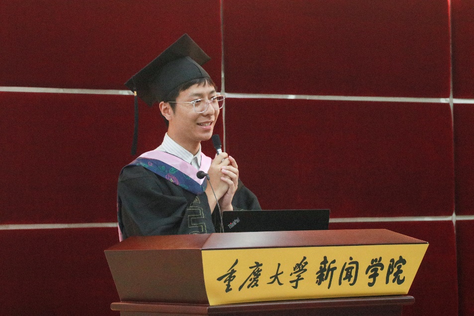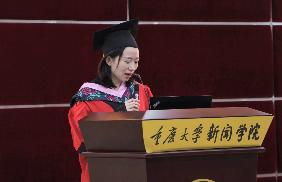 研究生毕业代表刘文斌同学发言。她以时光见证者的身份回顾了过往三年时光里国家、社会、公司、公司的发展,并期许同学们能举起时代的炬火,成为时代新的光和热。牢记“好学求真、力行至善”的院训,抱定为国家、社会服务的宗旨,以赤子之心,肩道远之任,日益精进,砥砺前行。