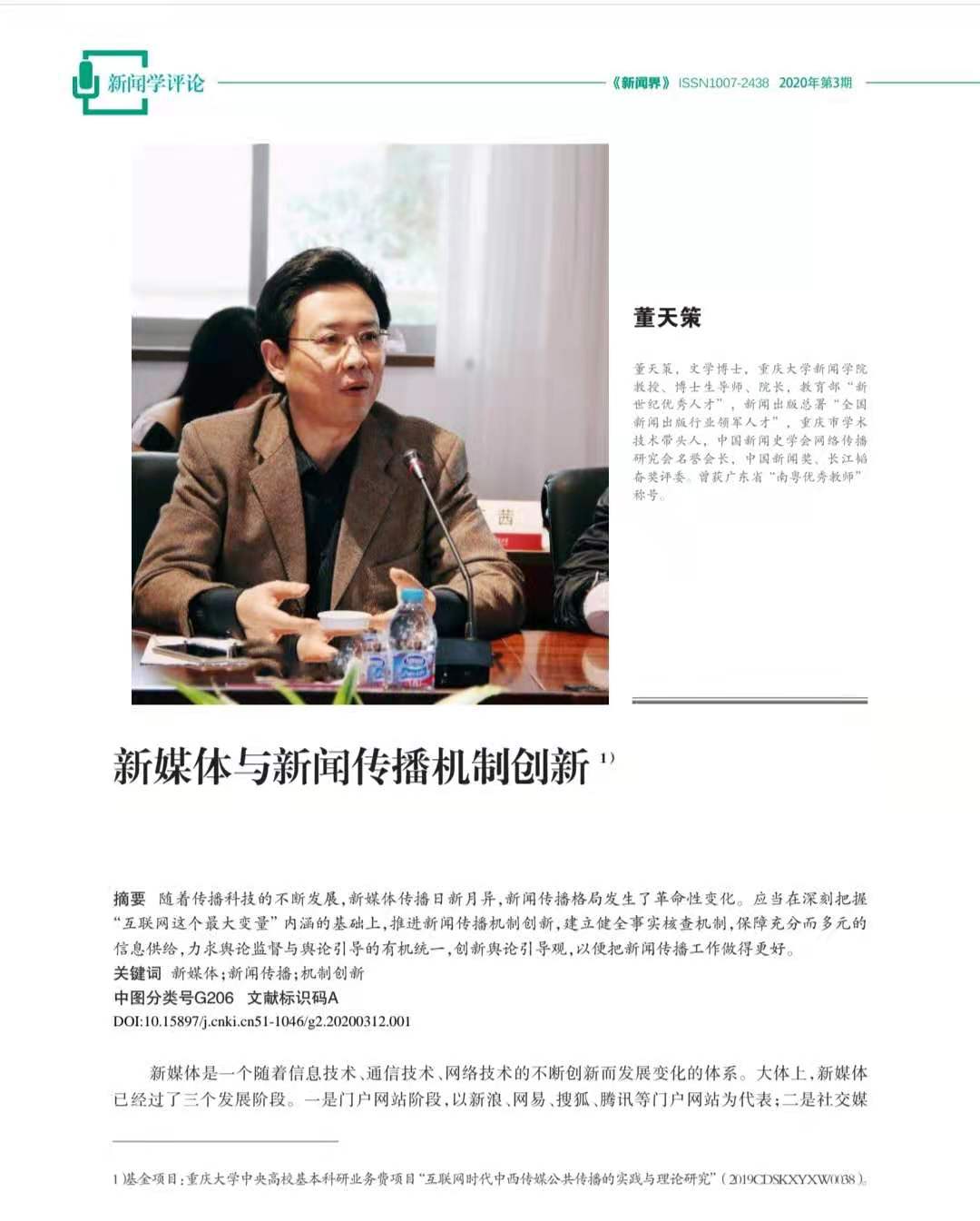 编者按:2021年7月6日,重庆市新闻工作者协会发布公告,第二十四届重庆新闻奖评选结果揭晓。共计360件作品获奖,其中特别奖1件,一等奖 64件,二等奖101件,三等奖194件。公司董天策教授《新媒体与新闻传播机制创新》获新闻论文一等奖。现全文发表,以飨读者。