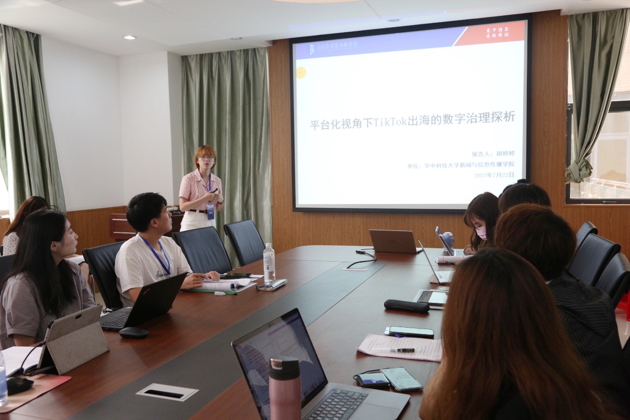 来自云南大学的李彤学员以青年群体为研究对象,探讨“新疆棉花”事件青年政治参与行为的生成机制以及具体的情感倾向的研究;中国传媒大学冉旻鹭、阎庆宜两位学员对微博、推特两个平台中参与“新疆棉事件”的社交机器人展开研究;同样来自中国传媒大学的肖玉笛以路透社关于TikTok在印度被禁用的报道作为研究对象,探究路透社的报告框架、报道内容、报道倾向;华中科技大学胡婷婷借用批判性话语分析法,从基础设施层、逻辑层和内容层考察TikTok相关的媒体报道;河南大学常淳以内容分析为主要方法,在文化复兴视域下对我国短视频海外传播策略展开研究;扬州大学袁凌钰借用非主流民众网络话语理论框架,做了题为“Competition or Cooperation?A Thematic Analysis of the Online Readers’ Comments on Has China Won”论文分享。