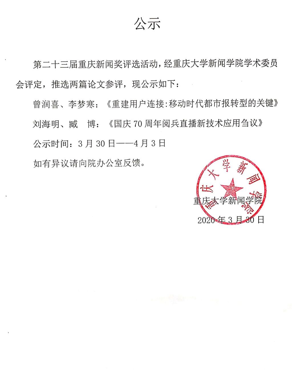 第二十三届重庆新闻奖评选活动参评论文推选公示