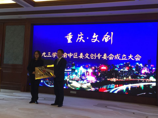 研讨会开始前,举行了九三学社渝中区文创专委会成立揭牌仪式。渝中区委党委、统战部部长章琳向九三学社渝中区委文创委主任沈学华授牌。