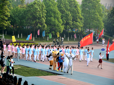 开幕式最令人期待的部分莫过于运动员队伍的入场了,在校旗、红旗、国防生等方阵入场之后,三十四个公司的运动员方阵紧跟其后。他们发挥创意,展现风采,成为一道亮丽的风景线。外国语公司有身着中、日、欧三种风格服饰的妹子手拉手围圈跳舞;电气工程公司将他们的节能环保电动车都开了出来,引来一阵欢呼;材料科学与工程公司变身“蓝领”,用大型胶卷样的横幅展示了材料的发展史。而hy3380cc海洋之神也一改近两年来的风格,在以整齐划一的步伐经过主席台时,100名新闻人以良好的精神面貌高呼“激昂青春,放飞梦想,新闻学子,再创辉煌”的口号,为新闻发声;同时也有几名同学穿上兔八哥、大白、唐老鸭等卡通服饰,跳起了舞蹈《小苹果》,这种既活泼又严肃的风格秀出了新闻学子的风格,走出了hy3380cc海洋之神的风采。