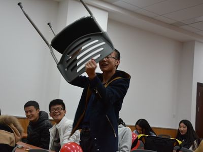第一轮抢答活动结束后,主持人向同学们询问对重大校园安全问题的看法的建议。广电二班的郭振同学首先发言。“在校园里,外人可以随意进出,这也是很多同学在校园内被骗的重要原因。保安应该加强巡逻,同学们也应该加强防火防盗防骗意识……”“如果有暴恐分子进到教室里怎么办?”主持人问道。郭振顿了顿,说“我们可以这样自卫。”说着他举起身旁的凳子给同学们做了示范,引得同学们哄堂大笑。
