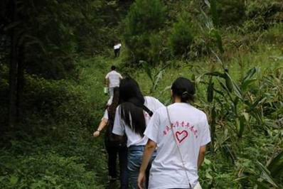 除了装扮布置,购买物品,志愿者们还抬着慰问品,徒步进入山区家访了3天。精英公司的团委书记王娟说,公司的员工大多住在山里,她本想让志愿者们就在县城里家访,但是遭到了拒绝。“每次一进山,基本上就得两个小时。”山路崎岖难行,有时雨后更是湿滑,一不小心就会摔跤。“我已经滑倒了三四次,屁股都摔疼了,单反相机的镜盖都裂了。”大二志愿者周林谈到,“不过三天的奔波很值得,身体上的疼痛是暂时的,心灵的触动才是永久的。”
