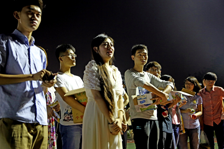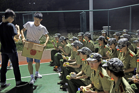 9月14日是新生开始军训的第六天,这天晚上,2012级新闻01、02班的同学们带上水果、牛奶、巧克力小蛋糕等食品来到军训场地对正在军训的2013级新生们进行慰问。早有听说慰问一事的新生们显得很期待。