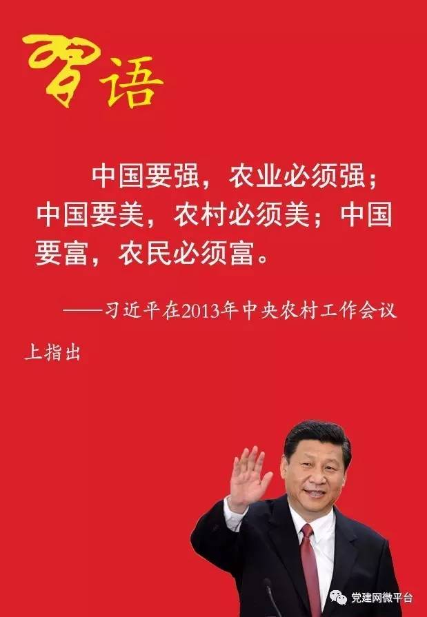 中国要强,农业必须强;中国要美,农村必须美;中国要富,农民必须富。农业基础稳固,农村和谐稳定,农民安居乐业,整个大局就有保障,各项工作都会比较主动。