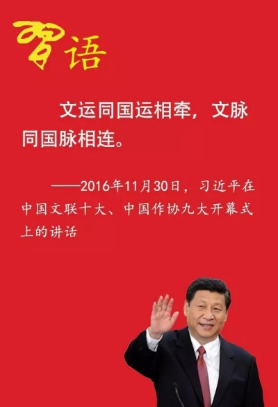 文运同国运相牵,文脉同国脉相连。实现中华民族伟大复兴,是一场震古烁今的伟大事业,需要坚忍不拔的伟大精神,也需要振奋人心的伟大作品。鲁迅先生1925年就说过:“文艺是国民精神所发的火光,同时也是引导国民精神的前途的灯火。”广大文艺工作者要坚持以人民为中心的创作导向,坚持为人民服务、为社会主义服务,坚持百花齐放、百家争鸣,坚持创造性转化、创新性发展,高擎民族精神火炬,吹响时代前进号角,把艺术理想融入党和人民事业之中,做到胸中有大义、心里有人民、肩头有责任、笔下有乾坤,推出更多反映时代呼声、展现人民奋斗、振奋民族精神、陶冶高尚情操的优秀作品,为我们的人民昭示更加美好的前景,为我们的民族描绘更加光明的未来。