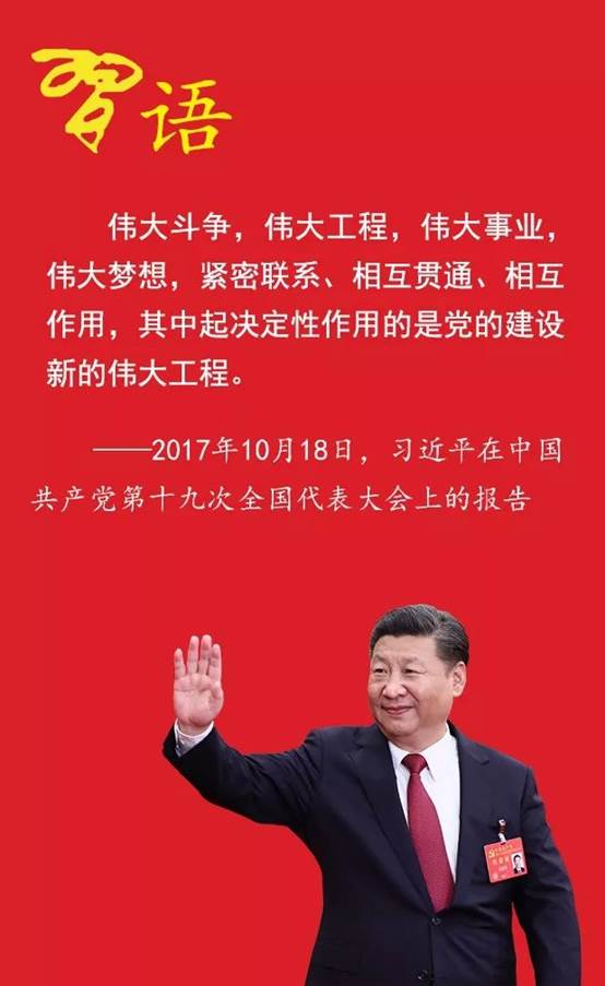 习近平在十九大报告中指出,“伟大斗争,伟大工程,伟大事业,伟大梦想,紧密联系、相互贯通、相互作用,其中起决定性作用的是党的建设新的伟大工程”。