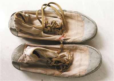 王继才生前穿过的黄胶鞋。因岛上空气湿度大、盐分高,胶鞋已严重褪色变形。
