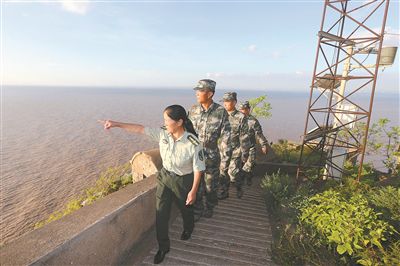 开山岛上乱石林立、风大路滑。一次巡岛时,王继才被大风刮到海里,险遭不测。此后,在大风天巡逻,夫妻俩就用绳子互相拴着走。巡逻路上要经过508个台阶,夫妻俩总是边走边数台阶。32年来,他们累计巡岛23000多小时,这里的每一块岛石、每一个台阶都见证着他们的付出与坚守。这是王仕花带着换岗民兵在开山岛上巡逻。