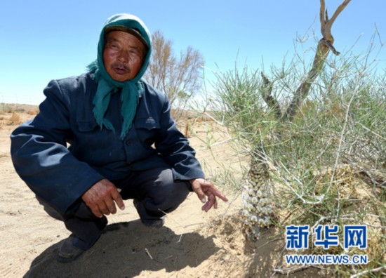 老图试验几次后发现种肉苁蓉的诀窍,先种梭梭,在梭梭根里撒上肉苁蓉的种子,肉苁蓉寄生在梭梭根上,稍微有一点水就能长得很好,这个办法比嫁接省事有效。他把这项技术传授给当地牧民,帮助他们找到了一条既治沙又致富的新路。