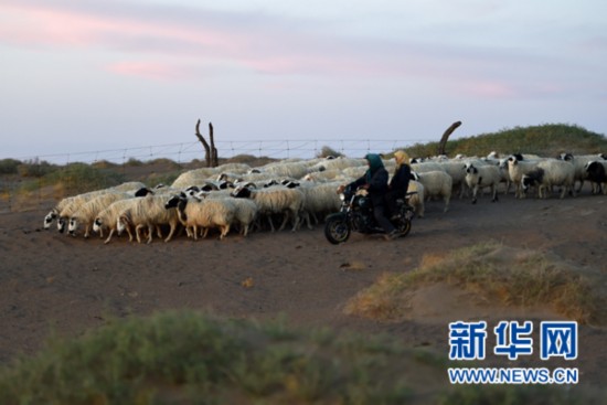 图布巴图和妻子陶生查干将羊群赶回家里(5月15日摄)。新华社记者 任军川摄