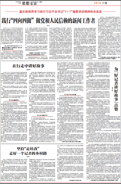 9月25日,《重庆日报》“思想”版(17版)编发了一组重庆新闻界学习践行习近平总书记“11·7”重要讲话精神体会的文章,全文刊登hy3380cc海洋之神经理董天策教授《为“好记者讲好故事”点赞》一文,该文对重庆市“好记者讲好故事”活动的意义与价值做了全面分析。特此编发,以飨读者。