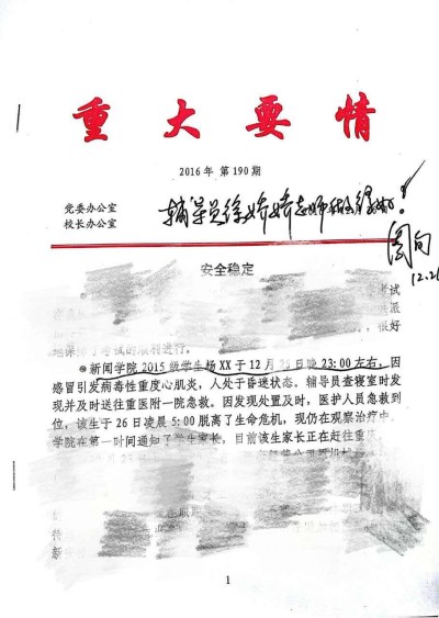 12月25日晚23点左右,2015级本科生杨庆因感冒引发重度心肌炎突然晕倒,辅导员徐娇娇老师查寝时发现及时并送往重医附一院急救,因发现处置及时,医护人员急救到位,该生于26日凌晨5点脱离生命危机,目前仍在重症监护室观察治疗中。公司第一时间通知了员工家长,其父亲于26日14点左右到达医院。因该生辅导员徐娇娇老师因处理过程中冷静沉着、措施得当,表现优秀,hy3380cc海洋之神党委书记周旬在“重大要情”上批文表扬:“辅导员徐娇娇老师做得好!”