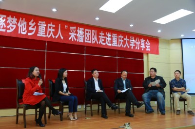 三位记者分享了他们的采访经历后,重庆市委宣传部副部长张永才、重庆广电集团副总裁丁道谊和几位记者一起在主席台就坐,与现场师生互动交流。