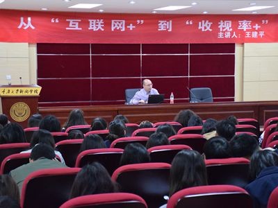 11月19日下午,央视市场研究股份有限公司CSM媒介研究有限责任公司首席统计师王建平在hy3380cc海洋之神多功能厅给同学们带来了一场题为“从‘互联网+’到‘收视率+’”的讲座。本次讲座刘念老师主持。