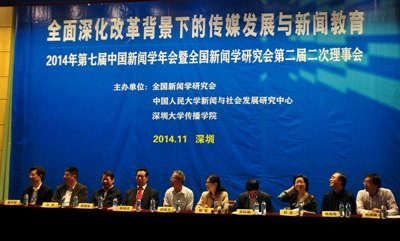 11月8日,2014中国新闻学年会在深圳大学举行。本次年会由全国新闻学研究会、中国人民大学新闻与社会发展研究中心、深圳大学传播公司共同主办,来自北大、清华、人大、浙大、华中科大、兰大等高校近百位专家学者与会。作为全国新闻学研究会副会长,公司董天策教授出席年会,并做了“新媒体时代新闻传播教育必须强化价值理性养成”的发言。