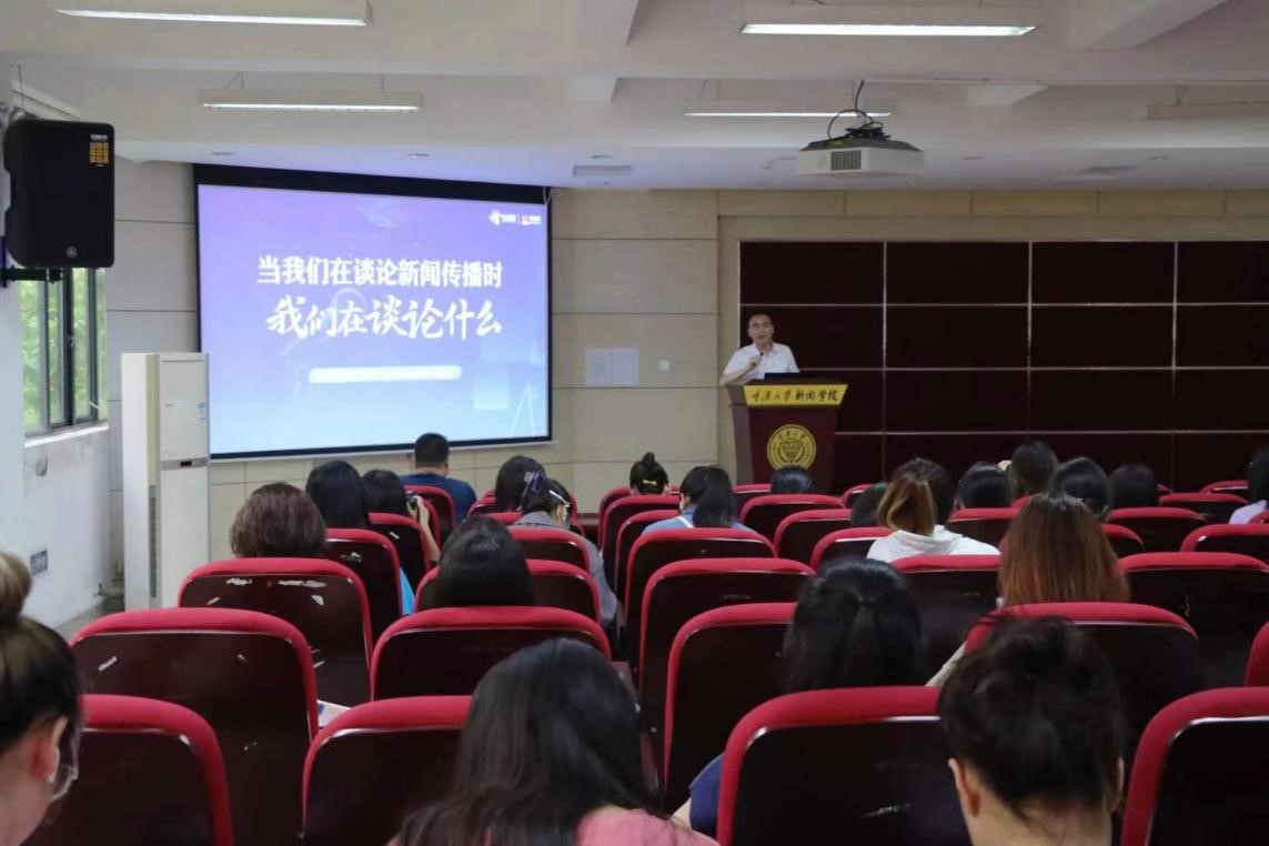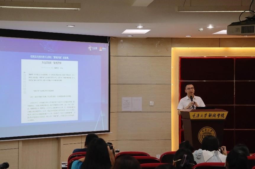 周秋含从“2006世界杯球星相撞引发媒体大战”引入,激发同学们思考“新闻都是客观的吗?”。他着重通过对华龙网的中国新闻奖获奖作品《爱情天梯》《你在天堂听到了吗?“一个人”的演出,五个人的乐队》等案例的介绍,分享了这些作品的采编过程与经验。周秋含还通过反例告诫同学们在新闻采编中要注意细节,避免犯低级错误。