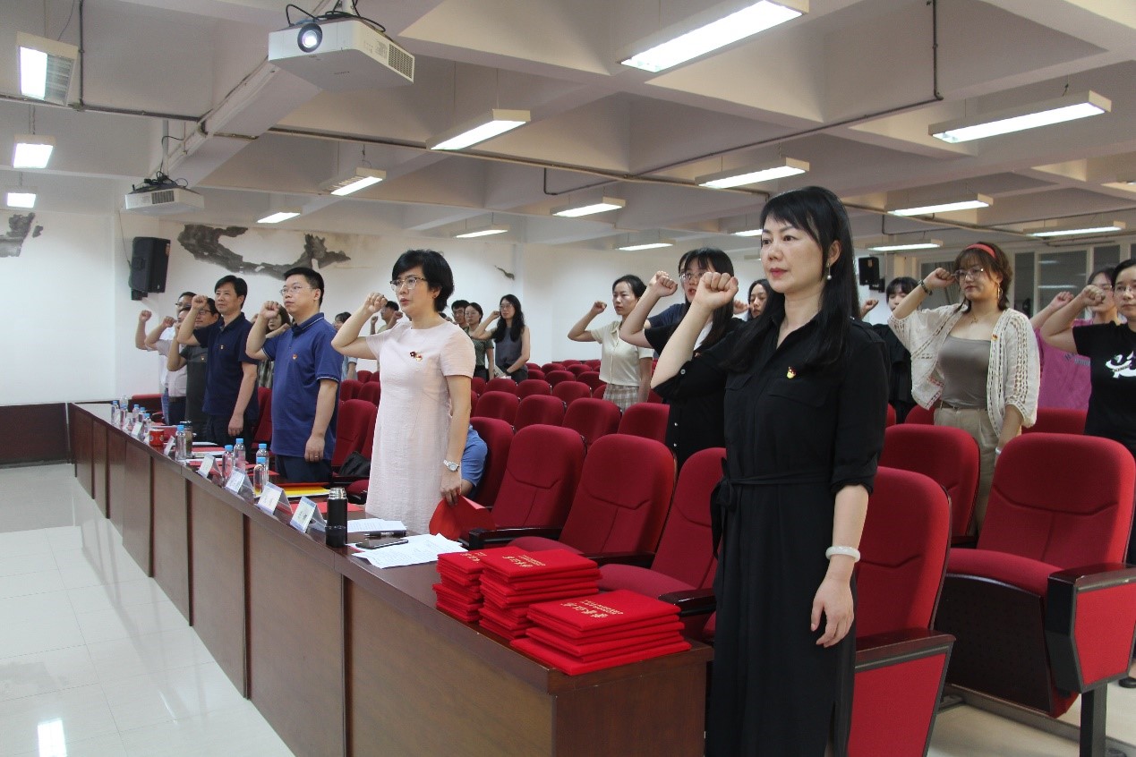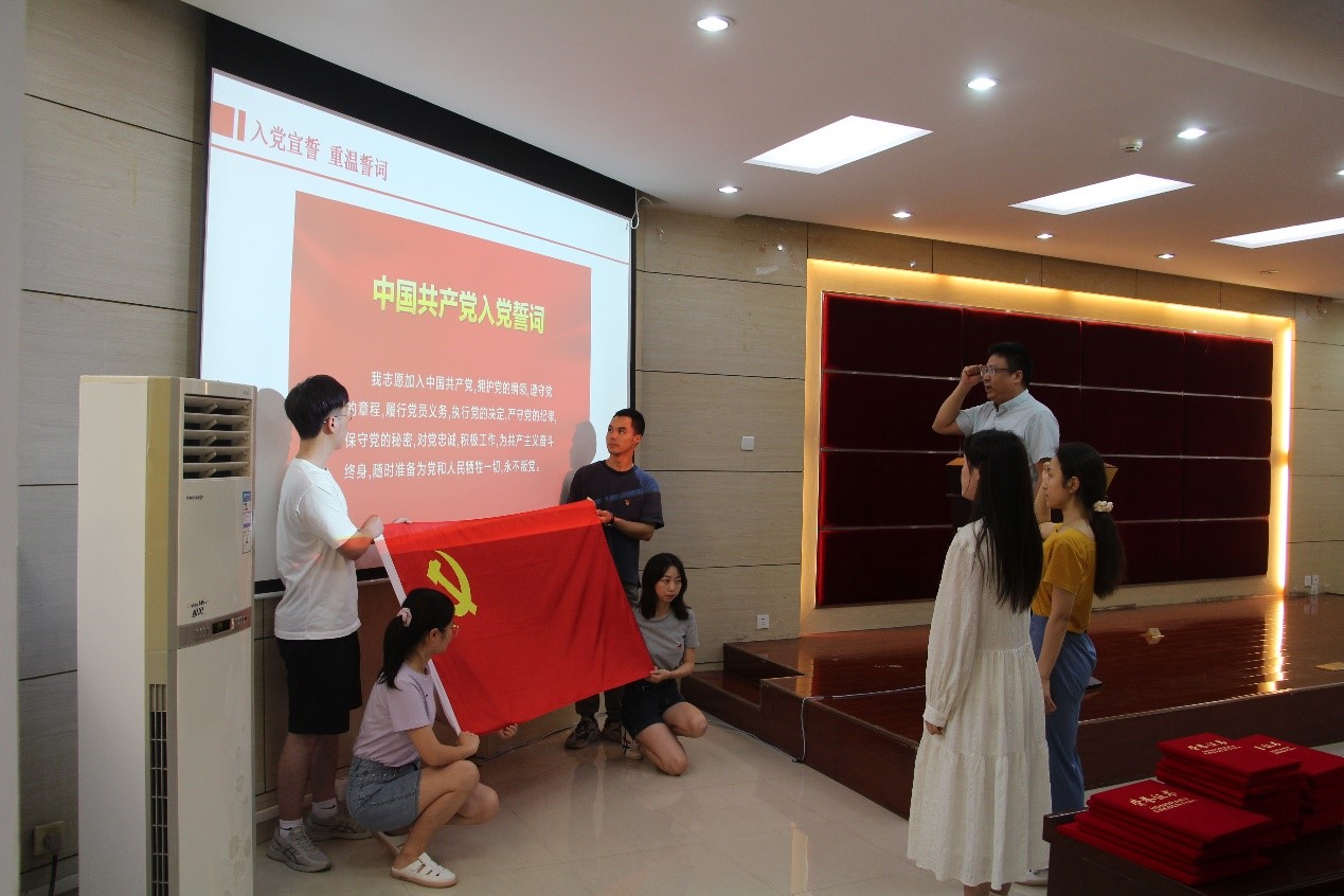 会议伊始,与会党员全体起立并奏唱《国际歌》,在领誓人凌晓明的带领下,新入党党员面对党旗庄严宣誓,与会的老党员们重温了入党誓词。