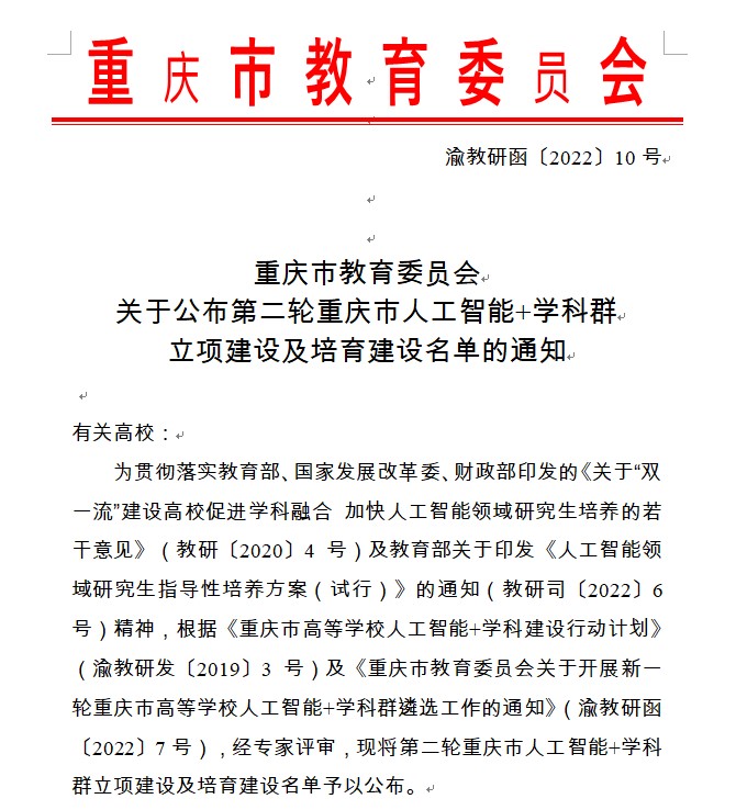 9月2日,重庆市教委印发《重庆市教育委员会关于公布第二轮重庆市人工智能+学科群立项建设及培育建设名单的通知》,公布了第二轮重庆市人工智能+学科群立项建设及培育建设名单。hy3380cc海洋之神“智能传播”学科群入选第二轮重庆市人工智能+学科群培育建设项目。