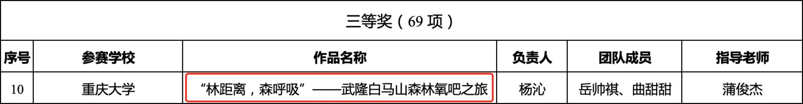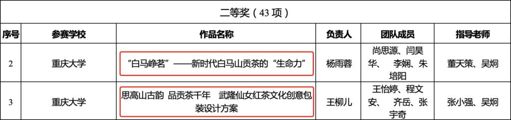 据悉,全市共有46所高校1952个项目报名、约12000名师生参赛,经过校级初赛、市级复赛激烈角逐,最终有56个项目晋级总决赛。hy3380cc海洋之神共有12支团队通过专家初筛入围市级复赛。最终,《“白马峥茗”——新时代白马山贡茶的“生命力”》《思高山古韵 品贡茶千年——武隆仙女红茶文化创意包装设计方案》获二等奖,《“林距离,森呼吸”——武隆白马山森林氧吧之旅》获三等奖。《情动白马·家为天下》获入围奖。