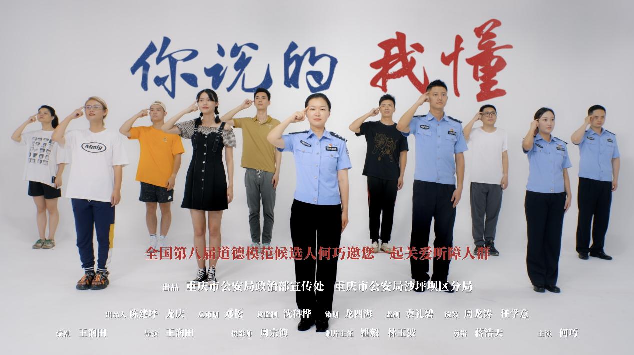 作品描述:本片以重庆市公安局沙坪坝区分局民警何巧和聋人群众之间的故事为创作契机,以何巧的手语和独白作为全篇的解说,把听人和聋人放在平等对话的层面上,开篇就提出“世界上大多数的问题,都是沟通的问题”,是一部民警宣传全社会关爱聋人的公益宣传片。通过展示每个人在生活中遇到的方言、代沟、外语障碍问题,唤起观众共情的同时告诉大家,有一些人一直面临着交流的问题,他们就是聋人,他们因为“听不到、说不了”,面临诸多沟通障碍,听人对他们充满误解,他们也对听人有着本能的疏离。而何巧通过管理聋人社区的亲身经历告诉大家,她是如何通过学习手语走进了聋人不一样的无声世界,聋人单纯而美好内心世界,对她无条件的信任与接纳,让她明白——最好的沟通就是“你说的,我懂”。从而倡导大家学习手语,关爱聋人。