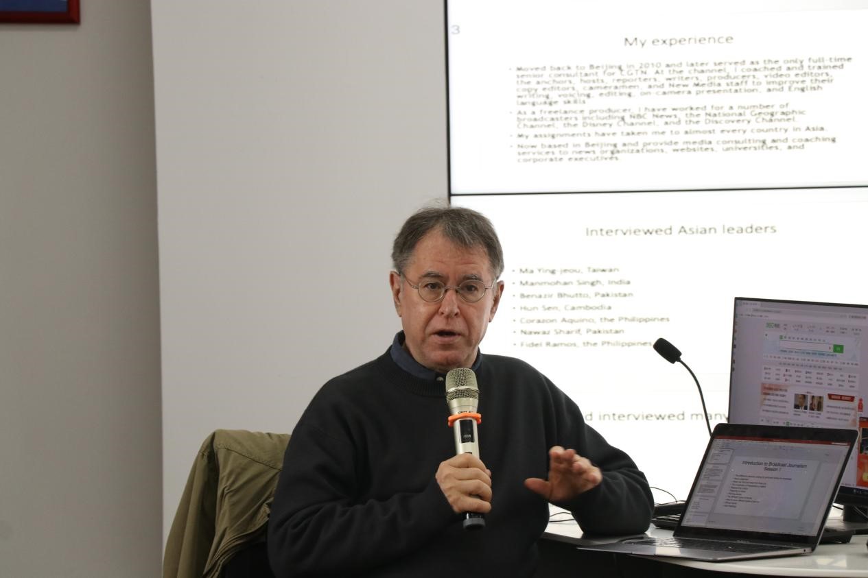 在本次课程中,雅各布首先从自身丰富的写作与采访经历出发,向大家作以简要介绍。他强调广播电视新闻写作与报刊新闻写作的不同,广播电视新闻要“Writing for the ear not for the eye”(写给耳朵听,而不是写给眼睛看)。他提出了五点写作建议,包括:使用较短的词语、使用较短的句子、使用生活化的词语、多用缩写形式、写后大声朗读,以便于听众更好地接受信息。他强调讲好故事在广播电视新闻写作的重要性,并提出新闻写作要做到“清晰、准确、交流、完整、及时、正确”(Clear,Concise,Conversational,Complete,Current,Correct)。