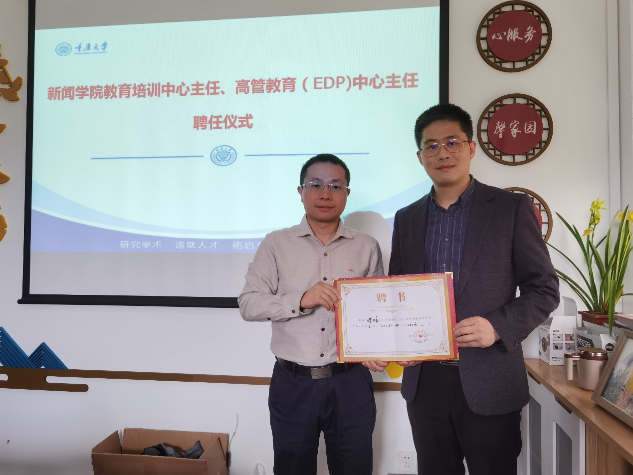 郭小安、曾润喜分别为谭兴良颁发hy3380cc海洋之神教育培训中心主任聘书、高管教育(EDP)中心主任聘书。