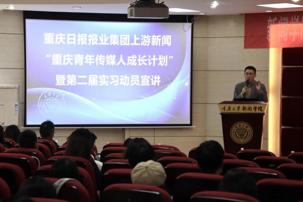 上游新闻编委冯飞详细介绍了“重庆青年传媒人成长计划”项目内容和本次拟招募实习生规模、培训过程、工作要求等,并现场解答了同学们关于实习时长、交通住宿、奖励措施等具体问题,号召员工积极参与第二届“重庆青年传媒人成长计划”,深入主流媒体,了解社会现状,为积极就业打好基础。