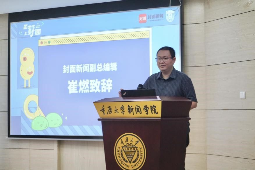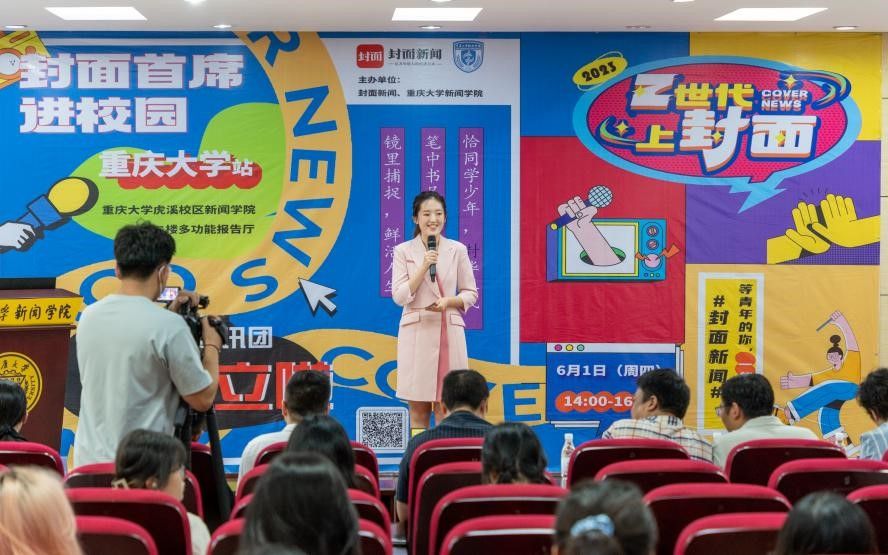 封面新闻科技新闻部副总监燕磊、运营传播中心资深内容运营陈雨分别进行主题宣讲。燕磊结合从事媒体记者的个人经历,从兴趣和热爱、成长与探索、创造与未来这三个方面,讲述融媒体时代传统媒体记者的转变。他与同学们分享在记者生涯中的感悟,提醒同学们在新闻采访中需要有共情力,但又不能受情绪左右,一个记者必须是公正和客观的记录者。他认为,现在这个时代其实是做新闻最好的时代,希望大家能怀着敬畏之心,保持独立和思考,带着内心深处的理想勇毅前行。