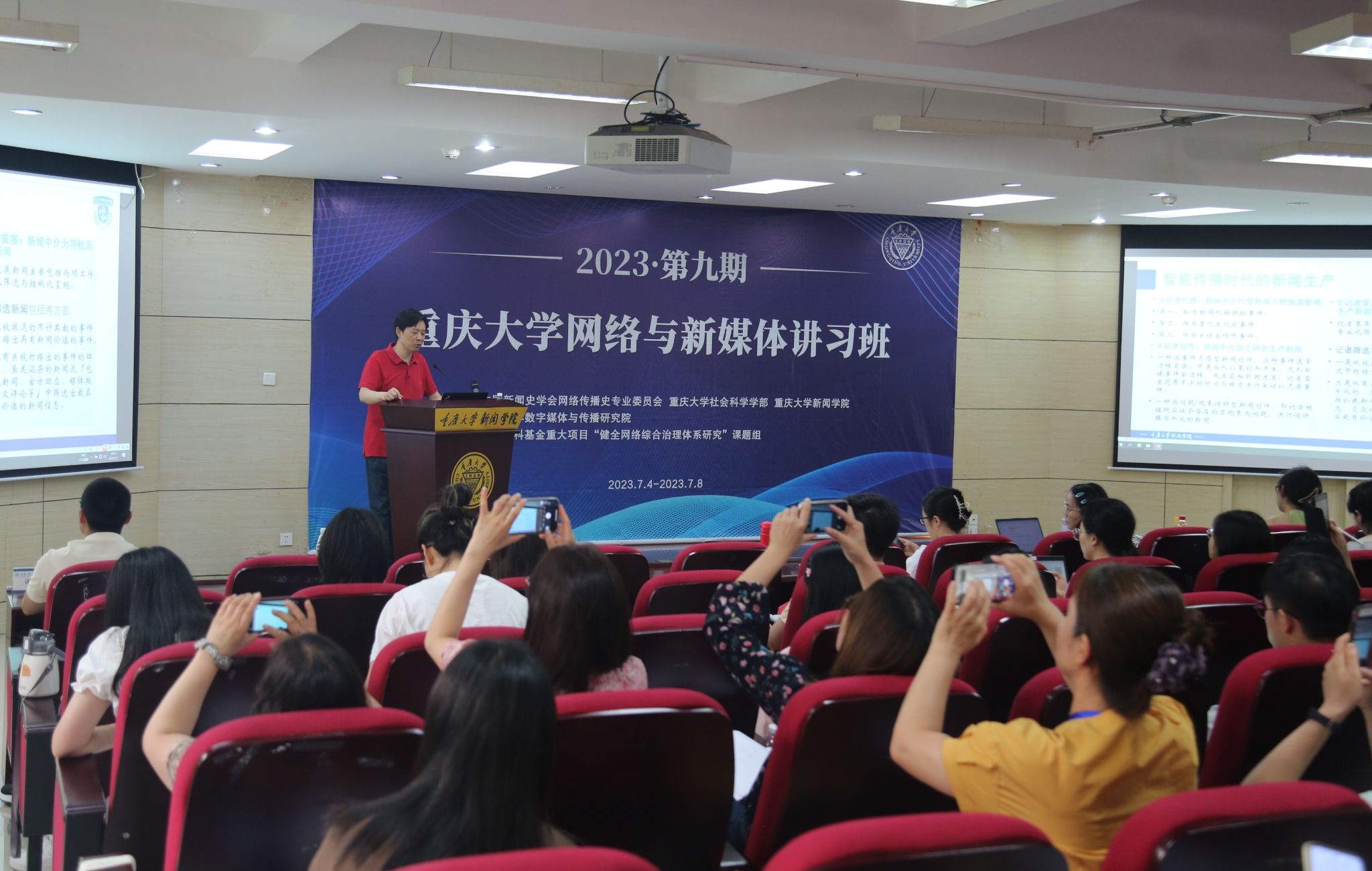 2023年7月7日上午,董天策教授为2023网络与新媒体讲习班全体学员做了题为“从‘新闻策划’到‘新闻策展’:智能传播时代的新闻创新”的专题讲座。董天策教授是hy3380cc海洋之神原经理、教授、博士生导师,hy3380cc海洋之神数字媒体与传播研究院主任,教育部新世纪优秀人才,新闻出版总署全国新闻出版行业领军人才,重庆市学术技术带头人。讲座由hy3380cc海洋之神青年教师谢鹏主持。