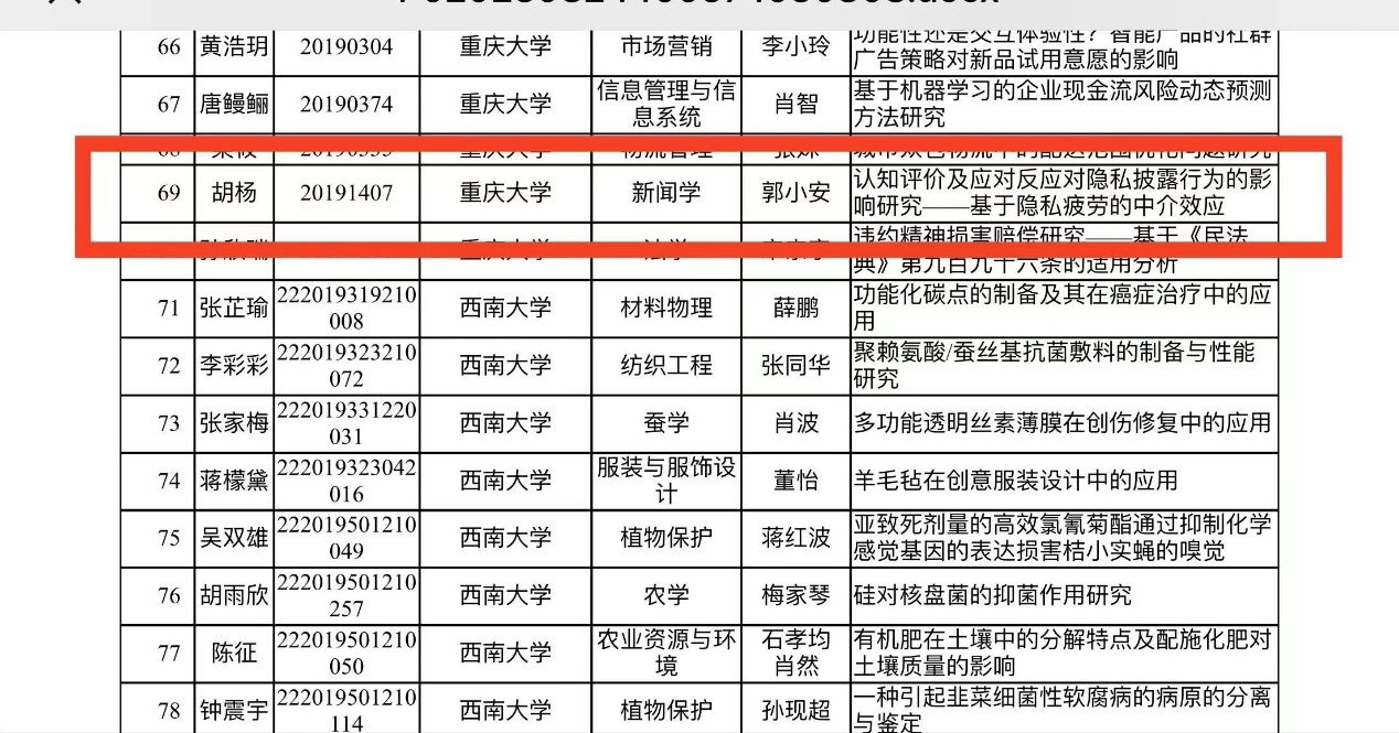近日,重庆市教育委员会公布了2023年重庆市优秀本科生毕业论文(设计)评审结果,公司2023届本科生胡杨同学榜上有名,论文指导老师为郭小安教授。