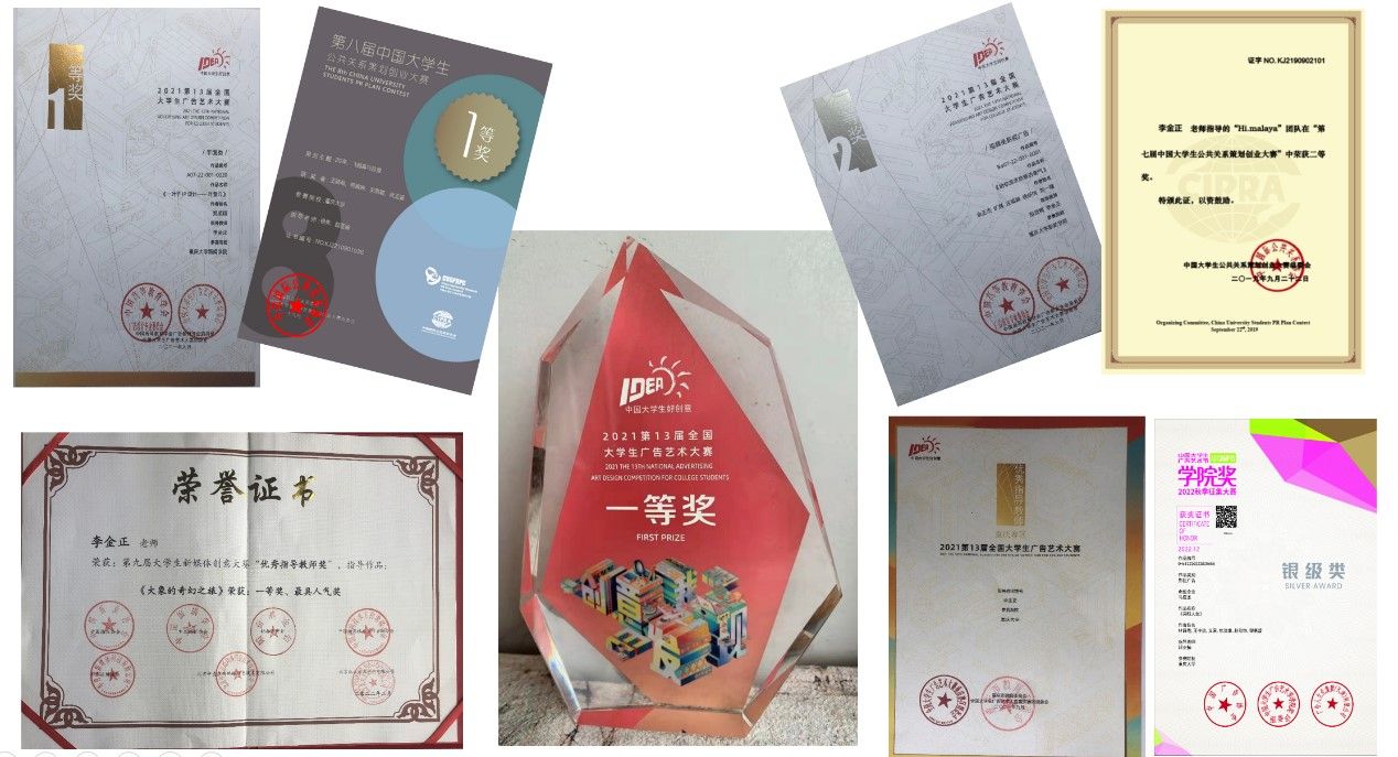 项。课程负责人李金正老师获得第九届全国老员工新媒体创意大赛“优秀指导教师奖”、第十三届全国老员工广告艺术大赛重庆赛区“优秀指导教师”等荣誉称号。