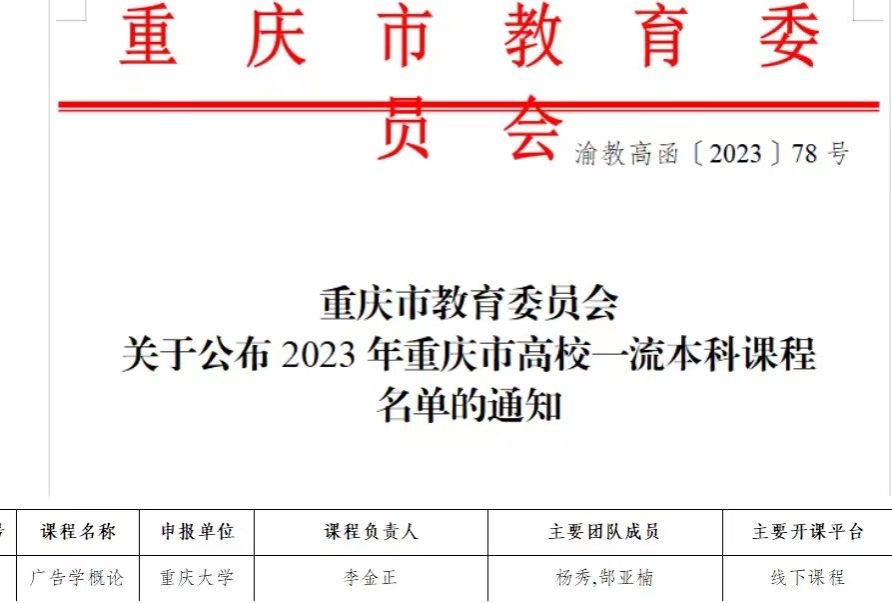 日前,重庆市教委发布了《重庆市教育委员会关于公布2023年重庆市高校一流本科课程名单的通知》(渝教高函78号)。经过高校自主申报、专家评议、复核与公示等多个环节,公司《广告学概论》课程成功入选重庆市高校一流本科线下课程。