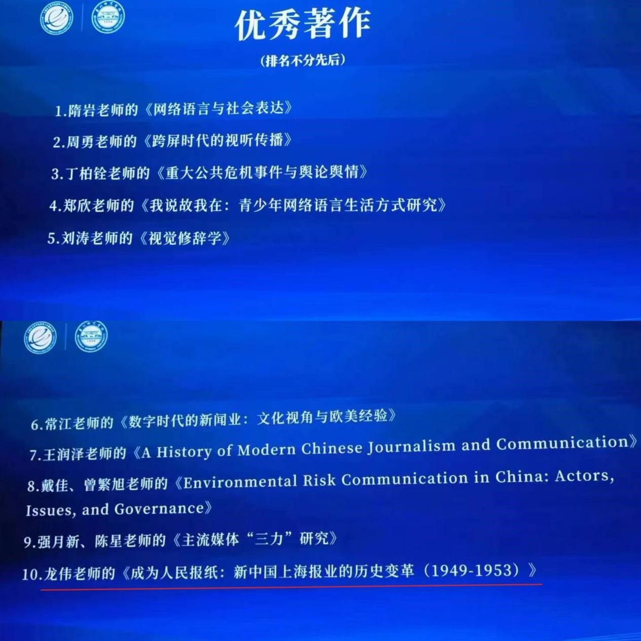 公司郭小安教授获得2021-2022年度“活跃的学术中坚”奖;龙伟教授的《成为人民报纸:新中国上海报业的历史变革(1949-1953)》获得“优秀著作”奖。公司11位员工获得2021-2022年度优秀学子奖,张心如、张媛获评为优秀本科生,方梓萱、符东、龚联康、胡艳娜、马晓晴、曾佳欣、朱珂欣获评为优秀硕士生,姜晓源和赵海明获评为优秀博士生。